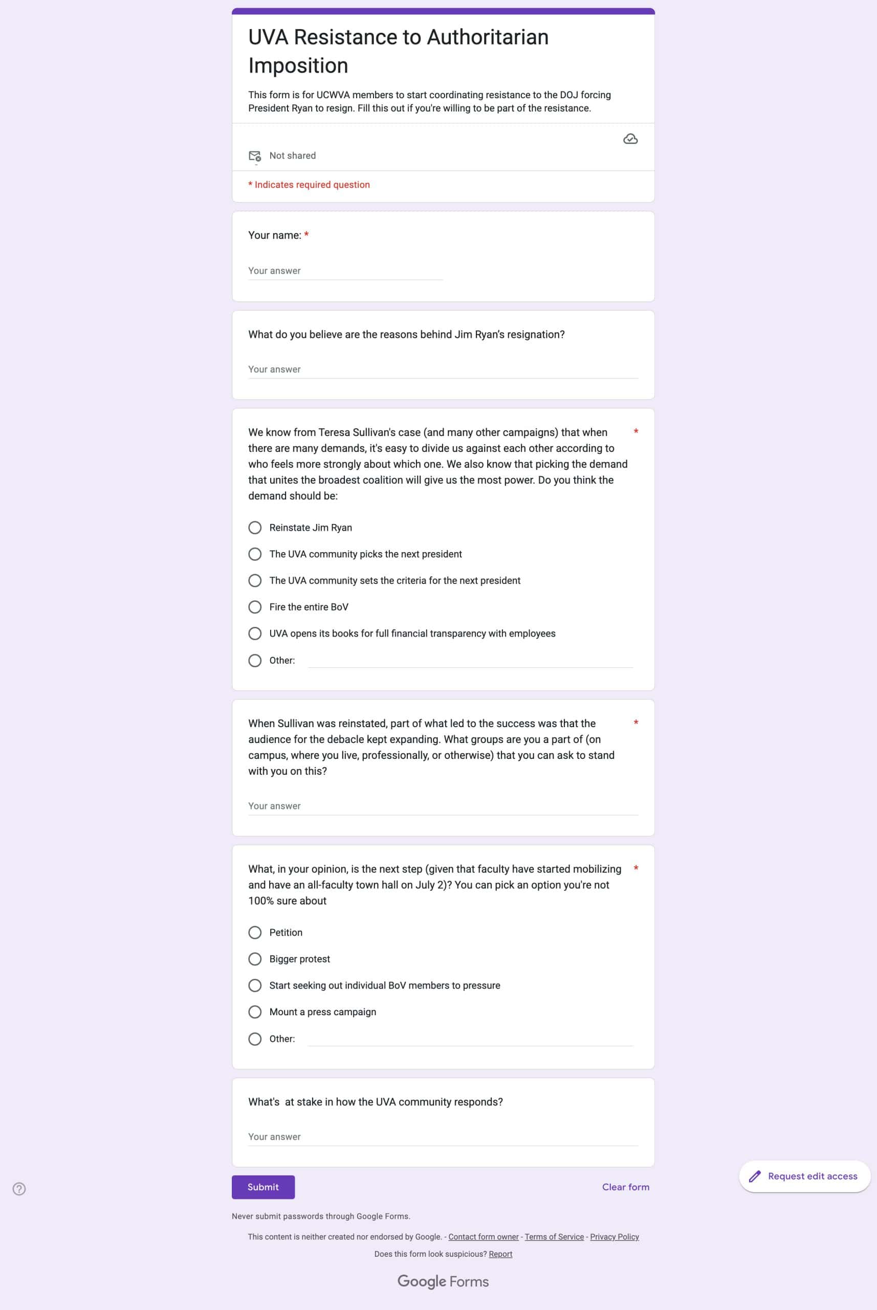The union’s online survey seeks input on reinstating Ryan, tasking the “UVA community” with selecting the next president, firing the Board of Visitors (BOV), and more. These actions are proposed to be accomplished via petition, widening protests, and the harassing of BOV members individually.